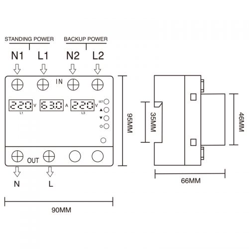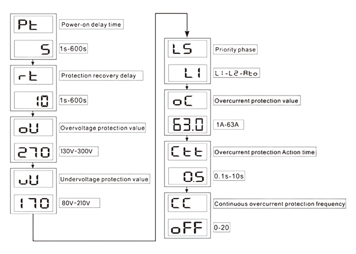 Automatic Changeover Switch ACS-VP1 HomeProductsAutomatic Transfer SwitchAutomatic Changeover Switch ACS-VP1 Automatic Changeover Switch ACS-VP1 Inquiry Back Out of stock., contact us Product Description MAIN FEATURES Automatic changeover switch Under voltage & Over voltage protection Over current protection TECHNICAL DATA Over voltage: AC 270v (AC 130V~300V adjustable) Under voltage: AC 170v (AC 80V~210V adjustable) Voltage hysteresis: 5V Over current protection: 1-63A adjustable 1. Number of continuous over current protection (cc setup) 2. Current failure: Start the relay after manual reset (press key ⏻) Ambient: -5°C ~ +40°C Product Feature SETTING INSTRUCTIONS Long press the down "SET" keys for 5s enter the SET state. Press the UP and DOWN keys to modify the over voltage, under voltage, current. press the SET key to save. Product Specification PARAMETER SETTING Standing power (priority phase) / Back up power (setup l5) When a power outage: over voltage or under voltage; failure occurs in the standing power, Acs-vp1 will switch from the standing power supply to the backup power supply to continue supplying power. When the standing power supply returns to normal, Acs-vp1 will switch from the backup power supply to the standing power supply.